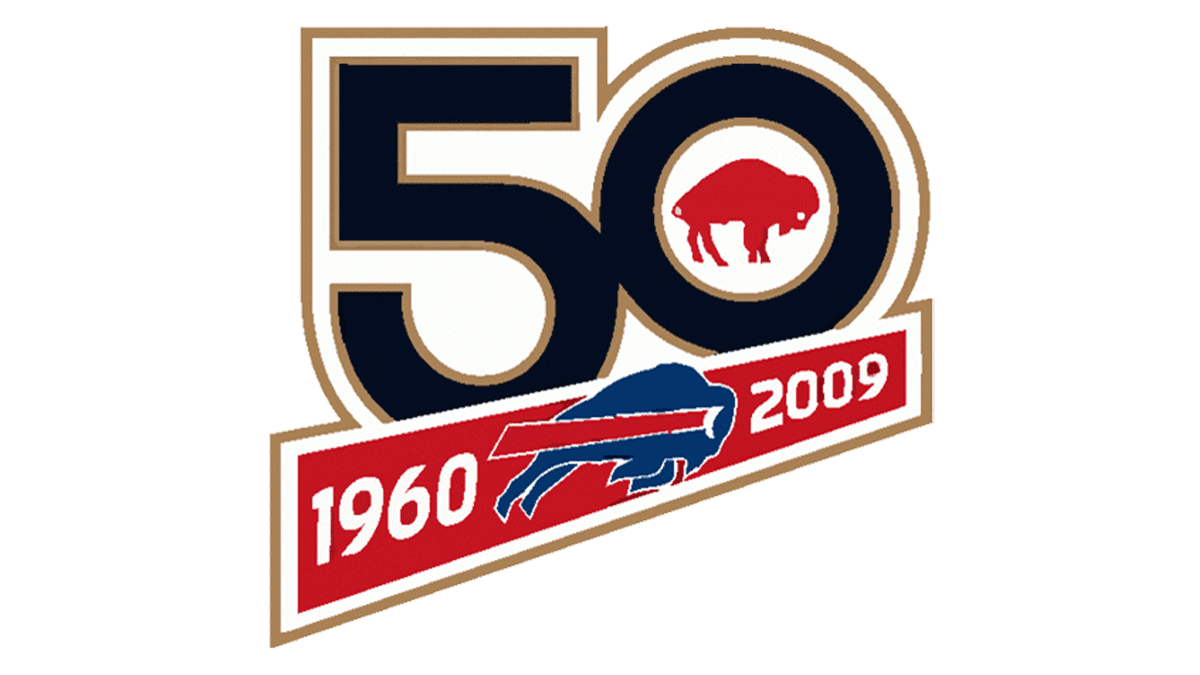 To celebrate the 50th season of the Buffalo Bills franchise, another anniversary logo was designed in 2009. The badge was based on an enlarged “50” drawn in thick black lines with a delicate golden outline, and placed on a white background. The negative space of the “0” was decorated with a solid red image of a buffalo. Another buffalo, but already in blue with a red stripe, was set on a diagonal banner at the bottom of the composition.