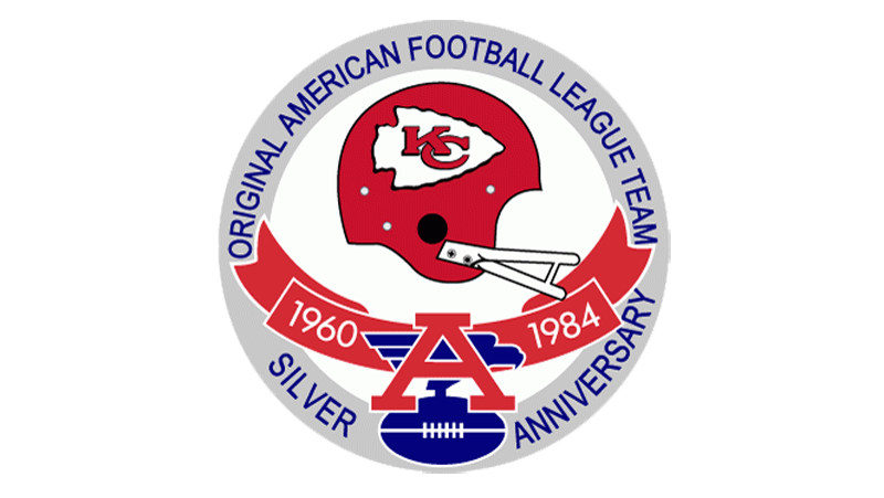 For the silver anniversary of the American Football League, the predecessor of the NFL, in 1984 a special badge was designed for each of the members, including Kansas City Chiefs. It was a white roundel with a gray frame and blue lettering around its perimeter. The central part of the badge was decorated with the image of the team’s helmet in red.